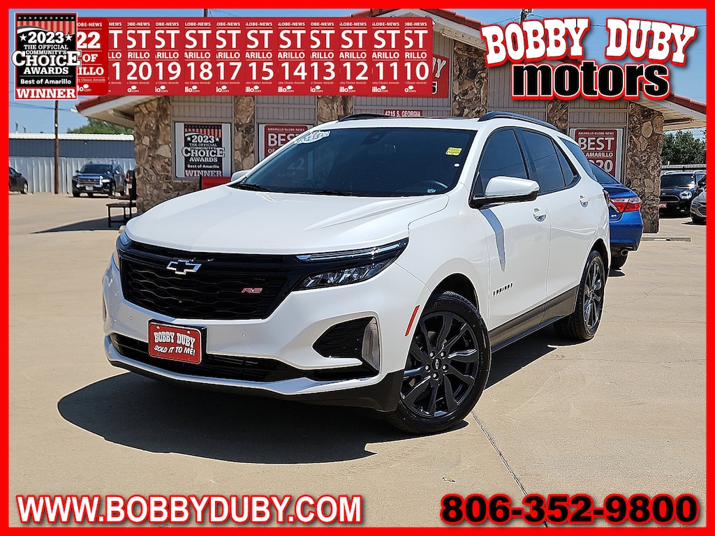 "Voted Best Used Car-Truck Dealer 2011201220132014201520172018201920202021202220232024! **SUNROOF** **ACCIDENT FREE CARFAX** **BLUE TOOTH - HANDS FREE* **REMOTE START** **BACKUP CAMERA** **CLEAN CARFAX ~CARFAX 1 Owner~ **KEYLESS ENTRY** $$APPLE CARPLAY$$ Equinox RS Iridescent Pearl Tricoat 120-Volt Power Outlet 19""Aluminum Wheels 2 Rear USB Charging-Only Ports 2 USB Data Ports 2 USB Data Ports w/SD Card Reader 4-Wheel Disc Brakes ABS brakes Adaptive Cruise Control Advanced Safety Package All-Weather Floor Mats Alloy wheels Automatic temperature control Bluetooth® For Phone Bumpers: body-color Cargo Mat Driver 8-Way Power Seat Adjuster Four wheel independent suspension Front Bucket Seats Fully automatic headlights HD Surround Vision Heated Driver & Front Passenger Seats Heated front seats Heated Steering Wheel Infotainment Package Interior Protection Package (LPO) Outside Heated Power-Adjustable Mirrors Power driver seat Power Liftgate Power Sunroof Power windows Preferred Equipment Group 1RS Radio: Chevrolet Infotainment 3 Plus System Rear window defroster Remote keyless entry Safety & Infotainment Package Security system SiriusXM Speed-sensing steering Split folding rear seat Steering wheel mounted audio controls Tilt steering wheel Traction control.Voted Best of Amarillo Used Car / Truck Dealer 2011 2012 2013 2014 2015 2017 2018 2019 2020 2021 2022 2023 2024! Huge Thank You to all of our customers that take the time to vote for us! We appreciate each and everyone of you!!!Bobby Duby Motors - Voted Best of Amarillo Used Car/Truck Dealer! 14 Years !"