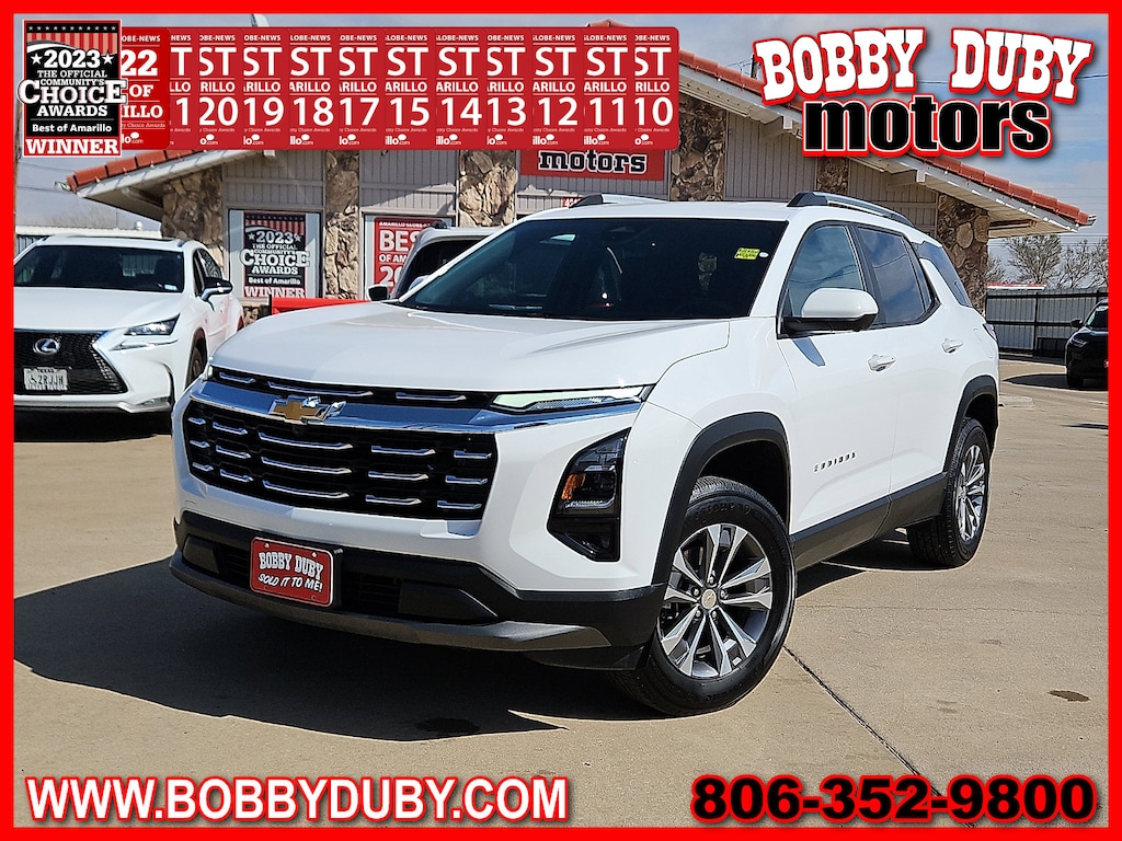 "Recent Arrival!Voted Best Used Car-Truck Dealer 2011201220132014201520172018201920202021202220232024! **LEATHER** **ACCIDENT FREE CARFAX** **BLUE TOOTH - HANDS FREE* **REMOTE START** **BACKUP CAMERA** **CLEAN CARFAX ~CARFAX 1 Owner~ **KEYLESS ENTRY** $$APPLE CARPLAY$$ Equinox LT 1.5L DOHC FWD 2-Way Power Driver Lumbar Control Seat Adjuster 4-Wheel Disc Brakes ABS brakes Air Conditioning AutoSense Hands-Free Power Programmable Liftgate Bumpers: body-color Cabin Humidity & Windshield Sensor Convenience Package II Driver 8-Way Power Seat Adjuster Dual-Zone Automatic Climate Control Electronic Stability Control Evotex Seat Trim Four wheel independent suspension Front Bucket Seats Front Center Armrest Front Fog Lamps Fully automatic headlights HD Surround Vision Heated Driver & Front Passenger Seats Heated front seats Heated steering wheel Heated Wiper Park Intermittent Front Rain-Sensing Wipers Overhead Sunglass Storage Power door mirrors Power windows Preferred Equipment Group 1LT Premium audio system: Chevrolet Infotainment 3 Programmable Universal Home Remote Radio: 11.3""Diagonal Advanced Color LCD Display Rear Pedestrian Alert Rear window defroster Remote keyless entry Safety & Technology Package Security system SiriusXM Speed control Speed-sensing steering Steering wheel mounted audio controls Traffic Sign Recognition Wheels: 17""Grazen Metallic Machined-Face Aluminum Wireless Charging for Devices.Voted Best of Amarillo Used Car / Truck Dealer 2011 2012 2013 2014 2015 2017 2018 2019 2020 2021 2022 2023 2024! Huge Thank You to all of our customers that take the time to vote for us! We appreciate each and everyone of you!!!Bobby Duby Motors - Voted Best of Amarillo Used Car/Truck Dealer! 14 Years !"
