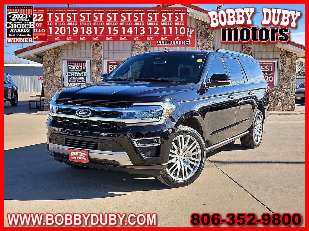 "Recent Arrival!Voted Best Used Car-Truck Dealer 2011201220132014201520172018201920202021202220232024! **NAVIGATION/ GPS/ NAV** **SUNROOF** **LEATHER** **ACCIDENT FREE CARFAX** **BLUE TOOTH - HANDS FREE* **REMOTE START** **BACKUP CAMERA** **CLEAN CARFAX **KEYLESS ENTRY** **HEATED / COOLED SEATS** **RUNNING BOARDS** **SECOND ROW CAPTAINS CHAIRS** $$APPLE CARPLAY$$ **Panoramic Sunroof** Expedition Max Limited EcoBoost 3.5L V6 GTDi DOHC 24V Twin Turbocharged 4WD Mahogany w/Heated & Ventilated Leather Front Captain's Chairs 3rd row seats: split-bench 4-Wheel Disc Brakes Alloy wheels Automatic temperature control Bumpers: body-color Ebony Black Mesh Grille Equipment Group 302A High Package Exterior Parking Camera Rear Four wheel independent suspension Fully automatic headlights Heated & Ventilated Leather Front Captain's Chairs Heated front seats Heated steering wheel Heavy-Duty Independent Suspension Magnetic-Painted Power Deployable Running Boards Navigation system: Connected Navigation Power driver seat Power Liftgate Power moonroof Power windows Power-Folding Sideview Mirrors w/Autofold Radio: B&O Sound System by Bang & Olufsen Rear air conditioning Rear window defroster Reclining 3rd row seat Remote keyless entry Security system SiriusXM w/360L Speed control Speed-sensing steering Steering wheel memory Steering wheel mounted audio controls SYNC 4 w/Enhanced Voice Recognition Tilt steering wheel Ventilated front seats Wheels: 22""12-Spoke Polished Aluminum.Voted Best of Amarillo Used Car / Truck Dealer 2011 2012 2013 2014 2015 2017 2018 2019 2020 2021 2022 2023 2024! Huge Thank You to all of our customers that take the time to vote for us! We appreciate each and everyone of you!!!Bobby Duby Motors - Voted Best of Amarillo Used Car/Truck Dealer! 14 Years !"