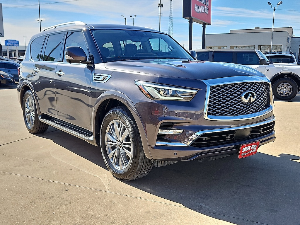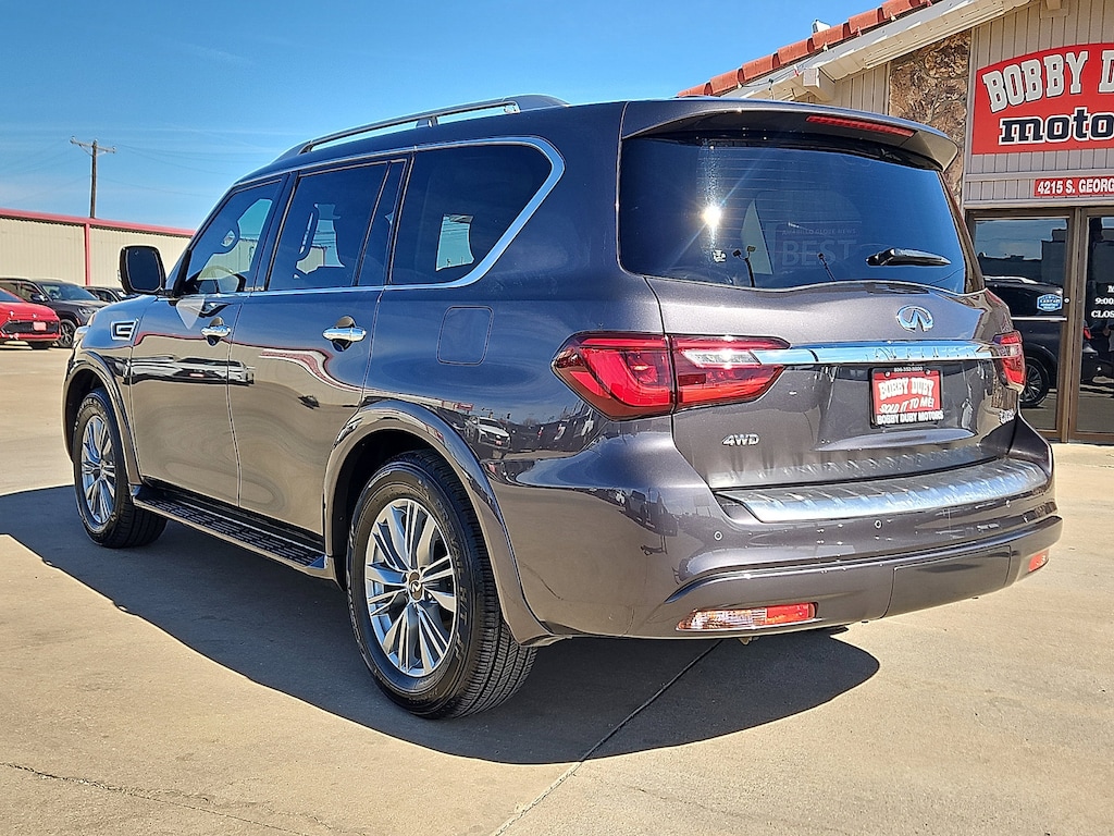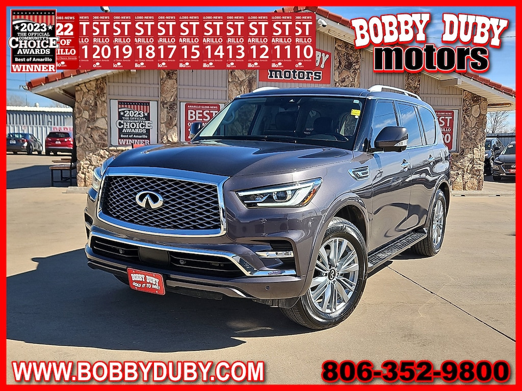 "Recent Arrival!Voted Best Used Car-Truck Dealer 2011201220132014201520172018201920202021202220232024! **SUNROOF** **LEATHER** **ACCIDENT FREE CARFAX** **BLUE TOOTH - HANDS FREE* **REMOTE START** **BACKUP CAMERA** **CLEAN CARFAX ~CARFAX 1 Owner~ **KEYLESS ENTRY** **SECOND ROW CAPTAINS CHAIRS** $$APPLE CARPLAY$$ QX80 LUXE 5.6L V8 4WD 20""Aluminum Alloy Wheels 3rd row seats: bench 4-Wheel Disc Brakes ABS brakes Air Conditioning Automatic temperature control Bumpers: body-color Four wheel independent suspension Front Bucket Seats Front Center Armrest Fully automatic headlights Heated Front Bucket Seats Heated front seats Leather-Appointed Seats Memory seat Navigation system: INFINITI InTouch Navigation Power driver seat Power Liftgate Power moonroof Power steering Power windows Radio: Bose Premium Audio System w/13 Speakers Rear air conditioning Rear window defroster Remote keyless entry Security system Speed control Speed-sensing steering Steering wheel memory Steering wheel mounted audio controls Tilt steering wheel.Voted Best of Amarillo Used Car / Truck Dealer 2011 2012 2013 2014 2015 2017 2018 2019 2020 2021 2022 2023 2024! Huge Thank You to all of our customers that take the time to vote for us! We appreciate each and everyone of you!!!Bobby Duby Motors - Voted Best of Amarillo Used Car/Truck Dealer! 14 Years !"