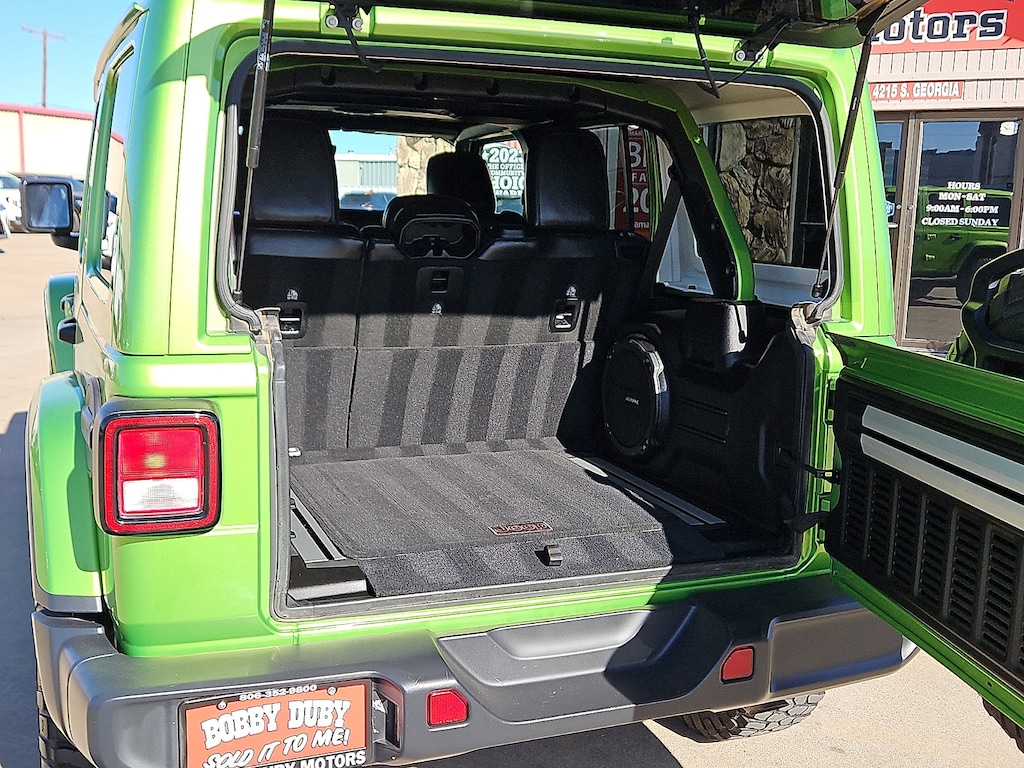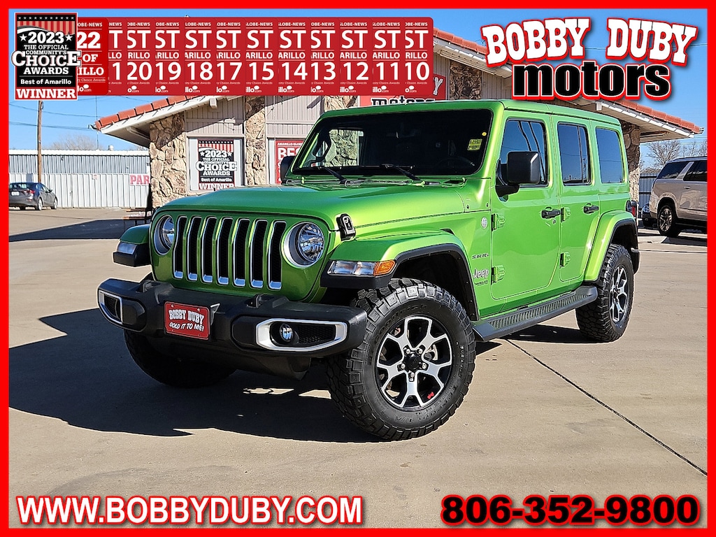 "Recent Arrival!Voted Best Used Car-Truck Dealer 2011201220132014201520172018201920202021202220232024! ** DEALER CERTIFIED 3 MONTH 3000 MILE POWERTRAIN WARRANTY ** **LEATHER** **ACCIDENT FREE CARFAX** **REMOTE START** **LOCAL TRADE** **BACKUP CAMERA** **CLEAN CARFAX **KEYLESS ENTRY** **LOCAL TRADE IN - NEVER A RENTAL** $$APPLE CARPLAY$$ Wrangler Unlimited Sahara 3.6L V6 24V VVT 4WD Mojito! Clearcoat Black w/Cloth Low-Back Bucket Seats or Leather Trimmed Bucket Seats or Leather Trimmed Seats w/Sahara Logo or McKinley Leather Seats w/Jeep Logo 4-Wheel Disc Brakes 4G LTE Wi-Fi Hot Spot 8.4""Radio & Premium Audio Group 8.4""Touchscreen Display Alloy wheels Auto-Dimming Rear-View Mirror Automatic temperature control Body Color 3-Piece Hard Top Cargo Compartment Floor Mat Cargo Group w/Trail Rail System Emergency/Assistance Call For Details Visit DriveUconnect.ca Front Bucket Seats Fully automatic headlights GPS Navigation HD Radio Heated Front Seats Heavy Duty Suspension w/Gas Shocks Leather Trimmed Bucket Seats Leather Trimmed Seats w/Sahara Logo Leather Wrapped Park Brake Handle Leather Wrapped Shift Knob No Soft Top ParkSense Rear Park Assist System ParkView Rear Back-Up Camera Power windows Quick Order Package 24G Radio: Uconnect 4C Nav w/8.4""Display Rear Window Defroster Rear Window Wiper/Washer Remote keyless entry Security system SiriusXM Traffic Plus SiriusXM Travel Link Speed control Steering wheel mounted audio controls Wheels: 18""x 7.5""Polished w/Gray Spokes.Odometer is 22303 miles below market average!Voted Best of Amarillo Used Car / Truck Dealer 2011 2012 2013 2014 2015 2017 2018 2019 2020 2021 2022 2023 2024! Huge Thank You to all of our customers that take the time to vote for us! We appreciate each and everyone of you!!!Bobby Duby Motors - Voted Best of Amarillo Used Car/Truck Dealer! 14 Years !"
