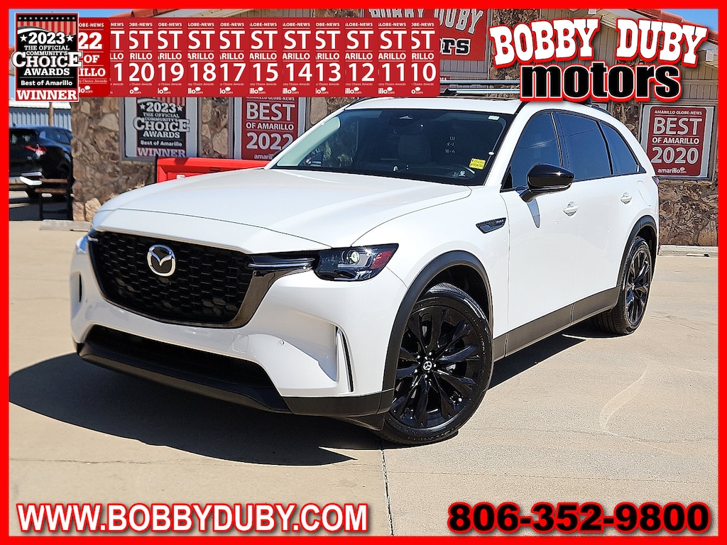 "Voted Best Used Car-Truck Dealer 2011201220132014201520172018201920202021202220232024! **NAVIGATION/ GPS/ NAV** **SUNROOF** **LEATHER** **ACCIDENT FREE CARFAX** **BLUE TOOTH - HANDS FREE* **BACKUP CAMERA** **CLEAN CARFAX ~CARFAX 1 Owner~ **KEYLESS ENTRY** **SECOND ROW CAPTAINS CHAIRS** $$APPLE CARPLAY$$ CX-90 PHEV Premium AWD Rhodium White Premium 2nd-Row Captain's Chairs 4-Wheel Disc Brakes Alloy wheels Automatic temperature control Bumpers: body-color Crossbars in Silver Exterior Parking Camera Rear Four wheel independent suspension Front Bucket Seats Front Center Armrest w/Storage Fully automatic headlights Heated Front Bucket Seats Heated front seats Leather Seat Trim Mazda Navigation System Memory seat Navigation system: MAZDA CONNECT Panic alarm Power driver seat Power Liftgate Power moonroof Power passenger seat Power windows Radio: AM/FM w/HD/Bose 12-Speaker Sound System Rear air conditioning Rear window defroster Remote keyless entry Rhodium White Premium Paint Charge Silver Roof Rack Cross Bars (DIO) Speed control Speed-sensing steering Split folding rear seat Steering wheel mounted audio controls Wheels: 21""x 9.5J Aluminum Alloy.Voted Best of Amarillo Used Car / Truck Dealer 2011 2012 2013 2014 2015 2017 2018 2019 2020 2021 2022 2023 2024! Huge Thank You to all of our customers that take the time to vote for us! We appreciate each and everyone of you!!!Bobby Duby Motors - Voted Best of Amarillo Used Car/Truck Dealer! 14 Years !"