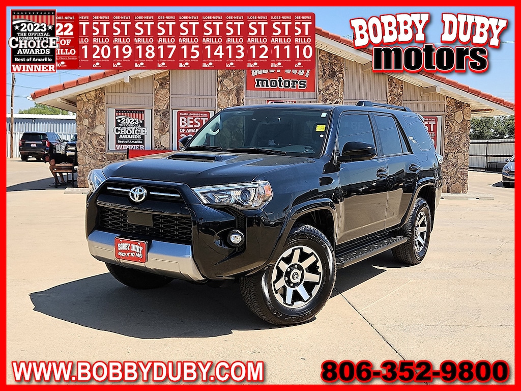"Voted Best Used Car-Truck Dealer 2011201220132014201520172018201920202021202220232024! **ACCIDENT FREE CARFAX** **BLUE TOOTH - HANDS FREE* **BACKUP CAMERA** **CLEAN CARFAX ~CARFAX 1 Owner~ **KEYLESS ENTRY** **RUNNING BOARDS** $$APPLE CARPLAY$$ 4Runner TRD Off-Road 4.0L V6 DOHC 24V 4WD Black/Graphite w/Fabric Seat Trim 4-Wheel Disc Brakes ABS brakes Air Conditioning Alloy wheels AM/FM radio: SiriusXM Apple CarPlay/Android Auto Black Roof Rails Bumpers: body-color Exterior Parking Camera Rear Fabric Seat Trim Front Bucket Seats Front Center Armrest Front fog lights Off Road Package Power driver seat Power steering Power windows Rear window defroster Remote keyless entry Security system Speed control Speed-sensing steering Split folding rear seat Steering wheel mounted audio controls Tilt steering wheel Traction control Wheels: 17""Unique 7-Spoke Off-Road Alloy.Odometer is 3222 miles below market average!Voted Best of Amarillo Used Car / Truck Dealer 2011 2012 2013 2014 2015 2017 2018 2019 2020 2021 2022 2023 2024! Huge Thank You to all of our customers that take the time to vote for us! We appreciate each and everyone of you!!!Bobby Duby Motors - Voted Best of Amarillo Used Car/Truck Dealer! 14 Years !"